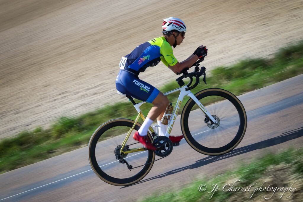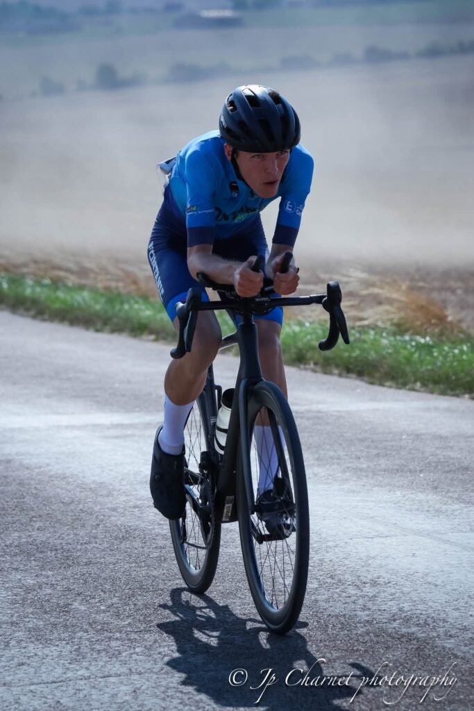 2ème étape : 63km et 400 D+, après une récupération active nous voilà repartis pour une deuxième étape en ligne avec circuit final. La course est ouverte par les motards de la gendarmerie, de quoi se croire en world tour ! Un fuyard prend rapidement l’échappée en solitaire, le Fontanil Cyclisme prend en charge la poursuite sous l’impulsion de Samuele et Nicolas S. Dans un mouvement de flottement Axel et un autre coureur en profitent pour partir en contre, bien aidé par ses coéquipiers qui contrôlent le peloton. Axel prendra finalement la deuxième place de cette étape !