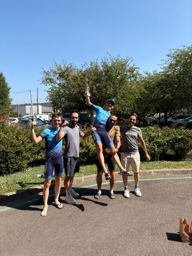 4ème étape : Les jambes sont lourdes mais cette dernière étape s’annonce décisive pour conserver le podium de Nicolas M. Le juge de paix sera une bosse à 9% de moyenne sur un peu plus d’un kilomètre. Si les premiers tours se passent sans encombre à la mi course tous les coureurs du Fontanil se retrouvent à l’avant sauf notre leader, panique à bord ! Ses jambes d’acier avec l’aide de ses coéquipiers, qui se seront relevés, permettront de sauver cette 3ème place !